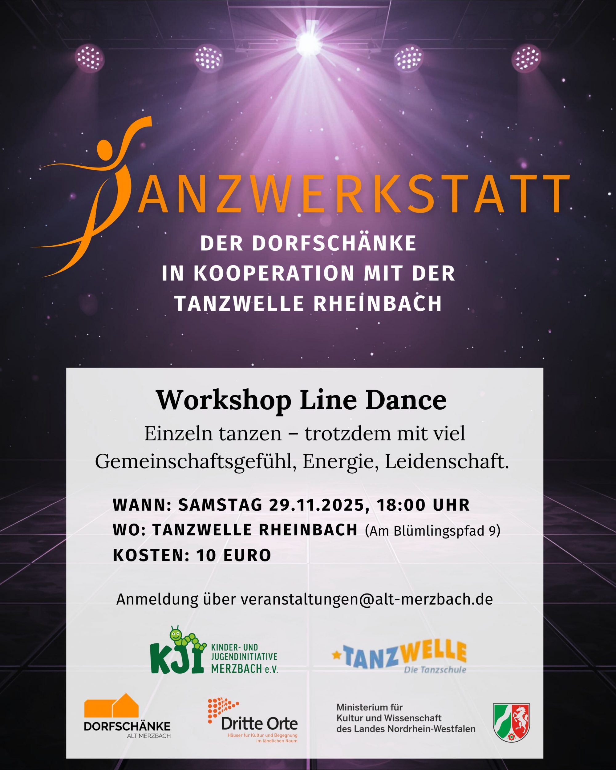 Tanzwerkstatt der Dorfschänke in Kooperation mit der Tanzwelle Rheinbach Wann 29. November 2025 Ganztägig Zum Kalender hinzufügen ICS herunterladen Google Kalender iCalendar Office 365 Outlook Live